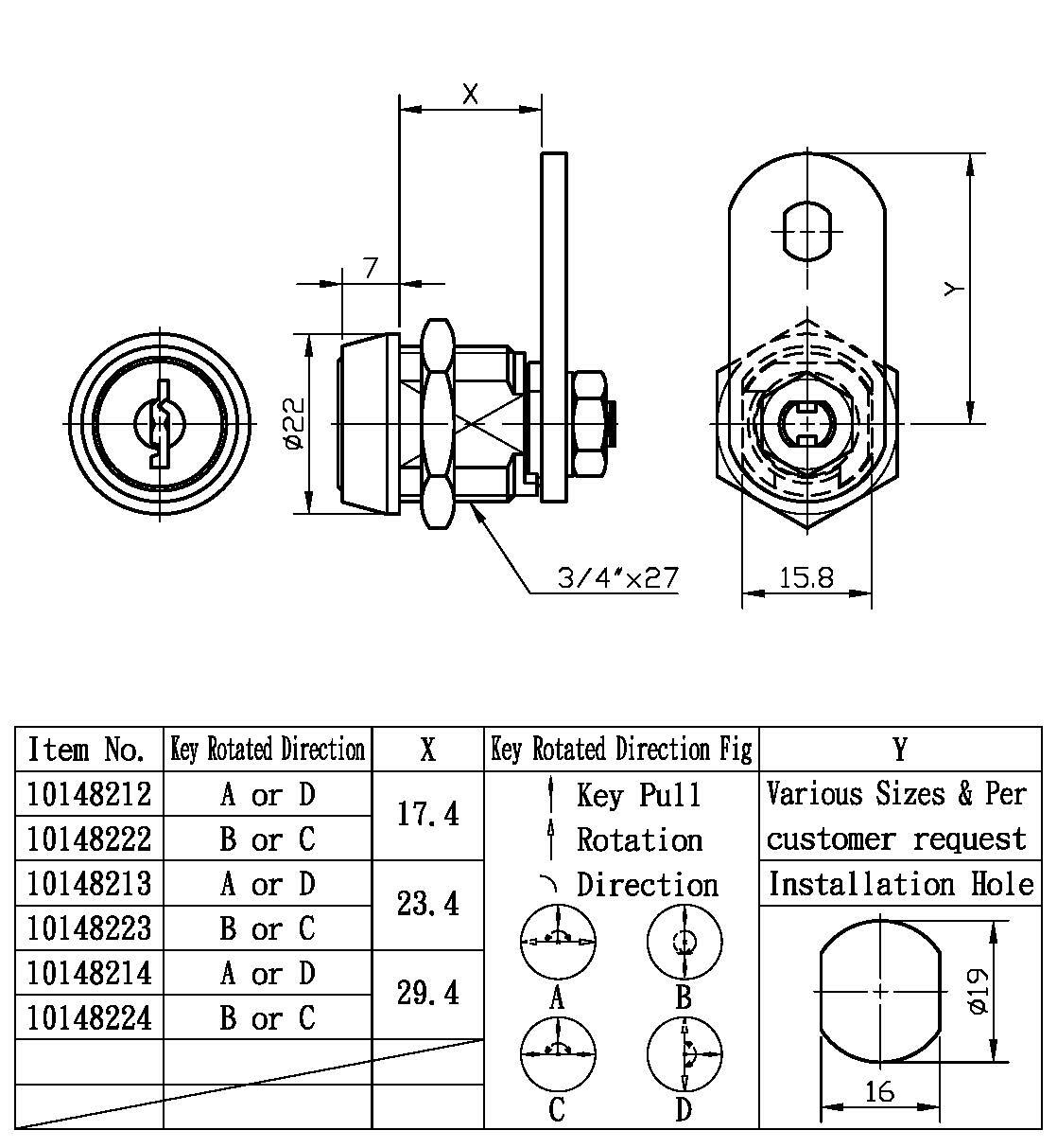 7. 付属品: ナットとカム (カム「A」はお客様のご要望に応じて、参考として提供)